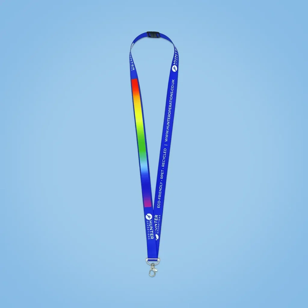 Printed Wide Clip-Free RPET Lanyards offer full-colour customisation and 100% recyclability - robust, sustainable and perfect for impactful event branding.