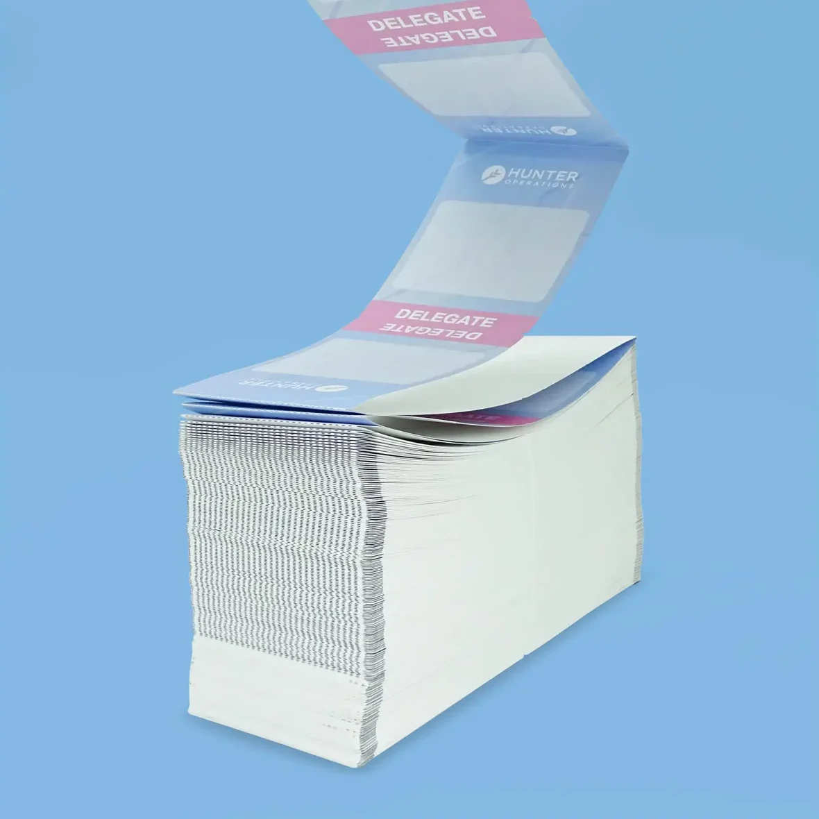 Printed Non-Adhesive Fanfold Badges are eco-friendly, FSC-certified, and reusable – perfect for sustainable name badges at large events.