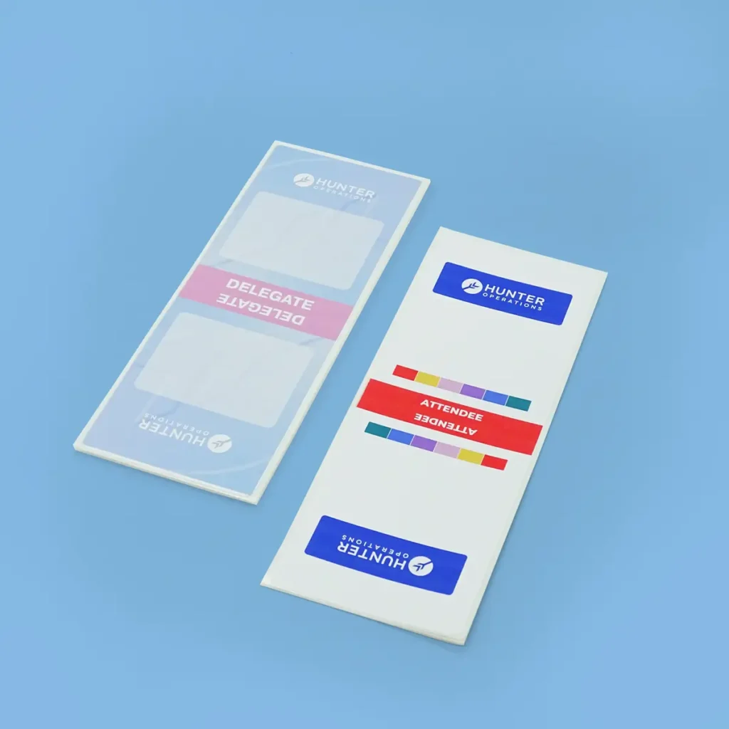 Printed Self-Adhesive Fanfold Badges are FSC-certified and eco-friendly - pre-printed or printable badges for professional, sustainable events.